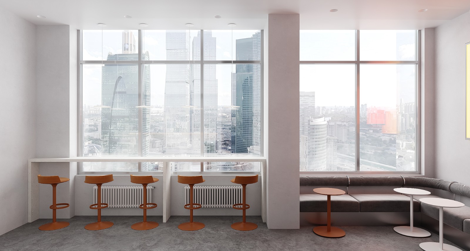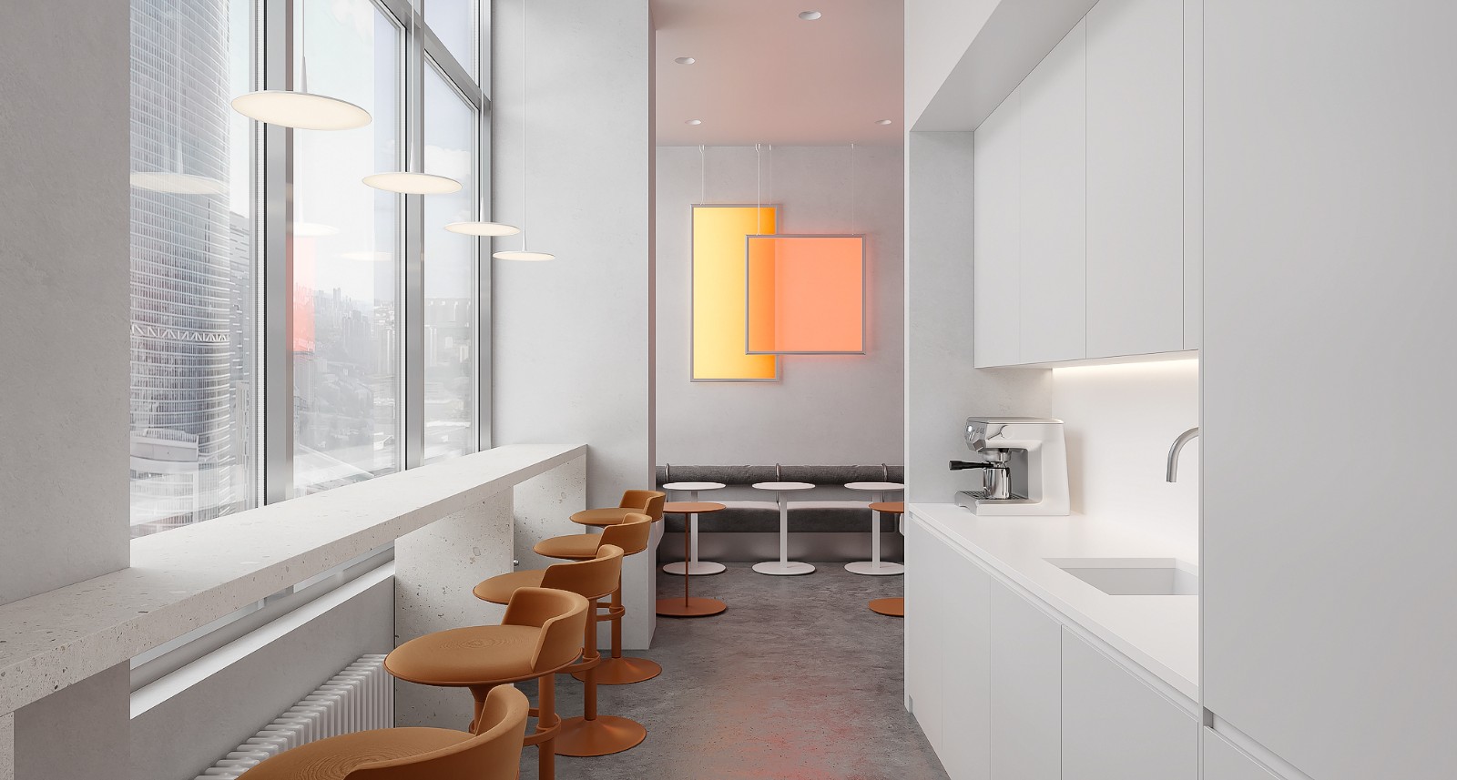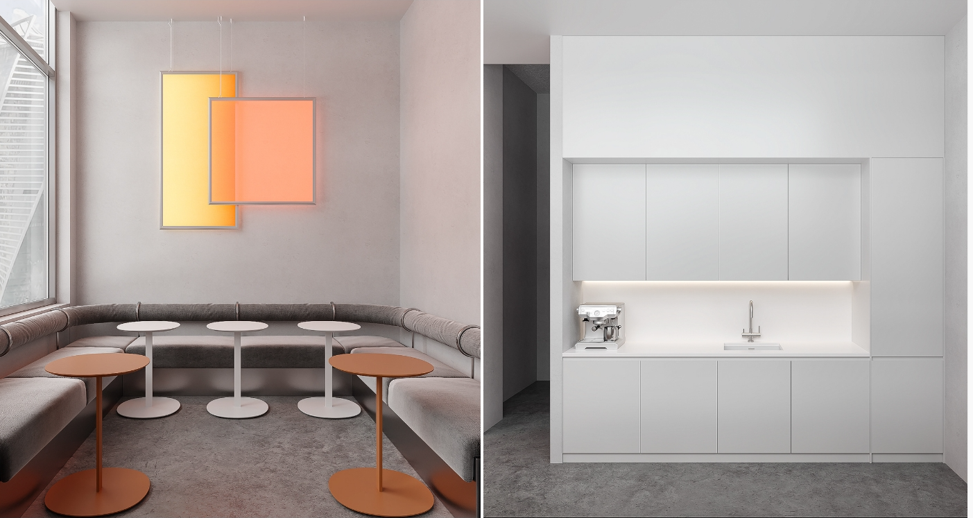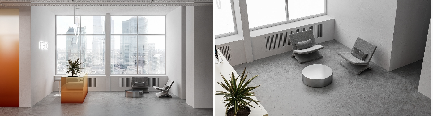 Having analyzed the company, as well as the average ages of the team (40+) and their needs, we decided to focus on simplicity and minimalism. Our team designed a coherent, monochrome space with no excess decor and visual noise, enhanced with polished metal constructions and other distinctive elements. Materials were implemented in their authentic state: concrete – rugged and textured, metal – rough and bare, wood – always genuine, never imitated.